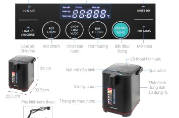 Tiện ích: Chế độ rót nước chậm chống bỏng, Có màn hình hiển thị, Cột hiển thị mực nước, Tự đun sôi lại khi nước nguội, Loại bỏ Clo
