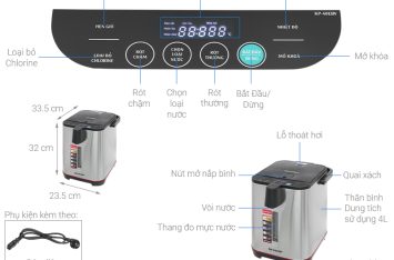 Tiện ích: Chế độ rót nước chậm chống bỏng, Có màn hình hiển thị, Cột hiển thị mực nước, Tự đun sôi lại khi nước nguội, Loại bỏ Clo