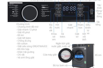 - Chương trình:Chỉ vắt, Đồ len, Đồ hỗn hợp. Đồ cotton, Vệ sinh lồng giặt, Giặt tiết kiệm, Giặt siêu sóng Greatwaves, Giặt nhanh 12 phút, Giặt 45 phút, Chống dị ứng, Khăn trải giường, Chương trình đã nhớ