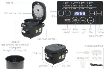 - Tiện ích:Hẹn giờ nấu xong, Có xửng hấp, Giữ ấm 24 giờ, Điều chỉnh thời gian nấu