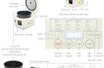 - Chức năng:Súp, Nấu nhanh, Hấp, Gạo trắng, Gạo thơm, Gạo nếp, Gạo lứt, Giữ ấm, Cơm sushi, Cháo