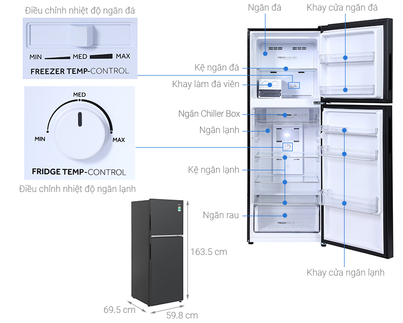 - Kích thước – Khối lượng:Cao 163.5 cm – Ngang 59.8 cm – Sâu 69.5 cm – Nặng 57 kg