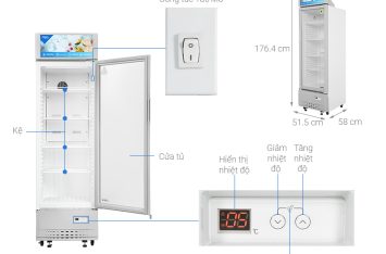 - Tiện ích:4 khay đựng, Hộp đèn LED, Nút điều chỉnh nhiệt độ bên ngoài tủ, Cửa kính, Bánh xe